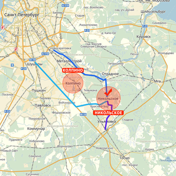 Расстояние от КАД С.-Петербурга: по Московскому шоссе и далее по Никольскому шоссе - 30 км, по Петрозаводскому шоссе и далее по дороге Ульяновка - Отрадное также 30 км.