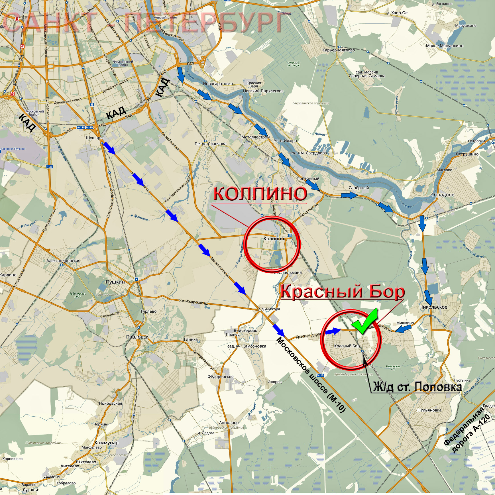 Расстояние от КАД С.-Петербурга: по Московскому шоссе и далее по Никольскому шоссе - 25 км, по Петрозаводскому шоссе и далее по дороге Ульяновка - Отрадное 32 км. От